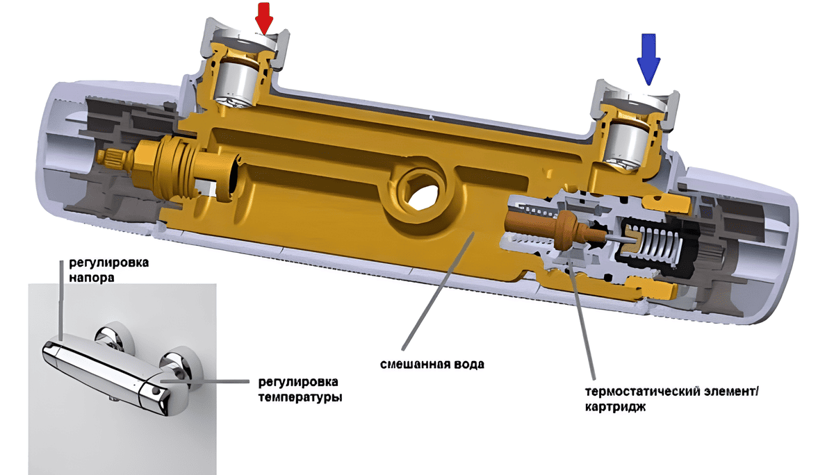 Главным элементом конструкции является чувствительный термостатический картридж или патрон. Он размещается в корпусе смесителя и реагирует на малейшие температурные «скачки». Чувствительность обусловлена использованием специальных материалов, характеризующихся способностью к расширению при смене температуры. В качестве такого материала нередко выступают биометрические пластины.