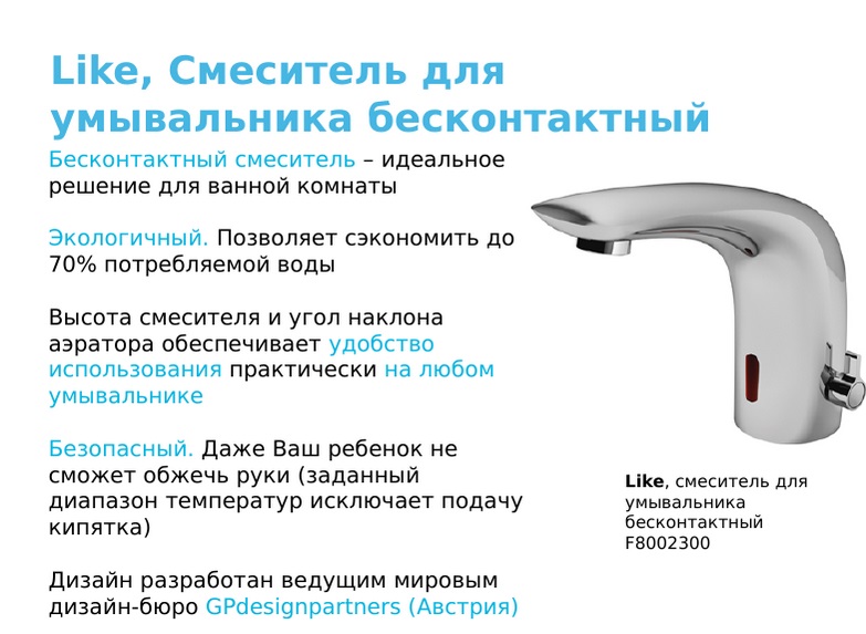 F8002300 Like Смеситель для умывальника, электронный, с регулировкой температуры, питание от батареек!