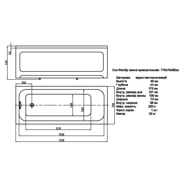 Длина, см:170Ширина, см:70Высота, см:62Глубина, см:44Форма:ПрямоугольнаяВнутр. размер дна, см:121Внутр. размер ванны, см:158Внутренняя ширина, см:58Вес, кг:35