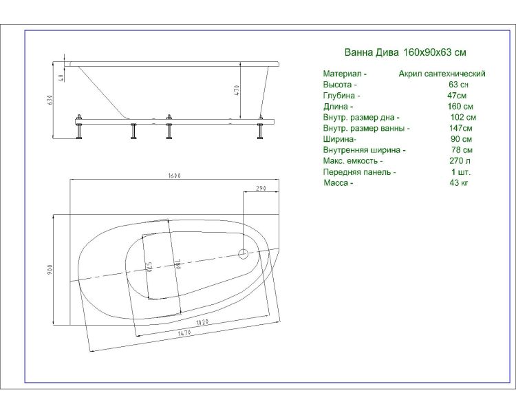Длина, см:160Ширина, см:90Высота, см:63Глубина, см:47Ориентация :ВсеФорма:АсимметричнаяВнутр. размер дна, см:112Внутр. размер ванны, см:157Внутренняя ширина, см:78Макс. емкость, л:290Вес, кг:45-