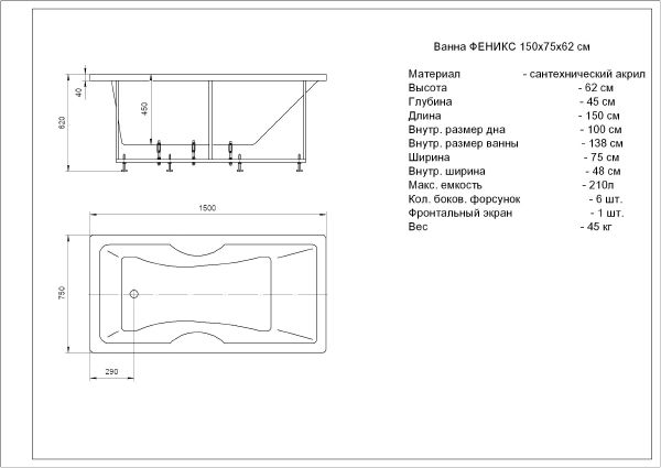 Длина, см:160Ширина, см:75Высота, см:62Глубина, см:45Форма:ПрямоугольнаяВнутр. размер дна, см:102Внутр. размер ванны, см:148Внутренняя ширина, см:49Макс. емкость, л:215