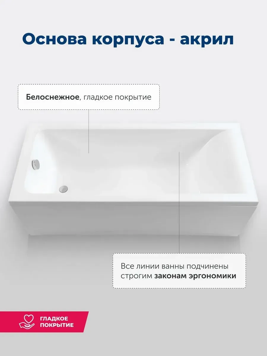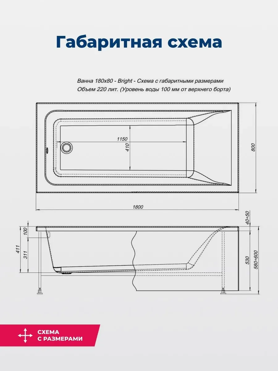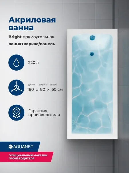 Акриловая ванна Aquanet Bright 180x80 создана с учетом растущего спроса на ванны простой прямоугольной формы в популярных размерах. Это модель с прямыми бортами и пологой спинкой, где соблюден идеальный угол для комфортного нахождения в ванне. Спинка плавно перетекает в бортик, поэтому релакс гарантирован даже без использования подголовника. Все линии ванны подчинены строгим законам эргономики. В современных условиях ширина ванны 80 см при длине 180 см - комфортные габариты, которые, к тому же, прекрасно вписываются в стандартную планировку современных ванных комнат. Чаша в этой ванне устроена таким образом, что для обозначенных размеров в ней достигнут максимально возможный внутренний объем, а именно 220 литров, и это при комфортной глубине в 411 мм от слива ванны до борта. Ванна рассчитана на нагрузку свыше 300 кг, так что даже крепкий мужчина сможет без опаски находиться в ней. Двойной слой армирования обеспечивает надежность чаши, а закладные из МДФ-плит в местах наибольшей нагрузки усиливают эффект.