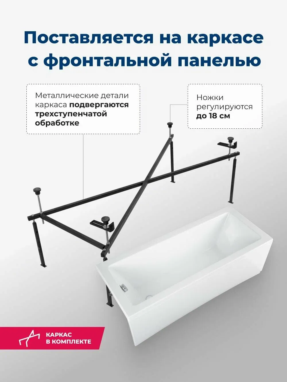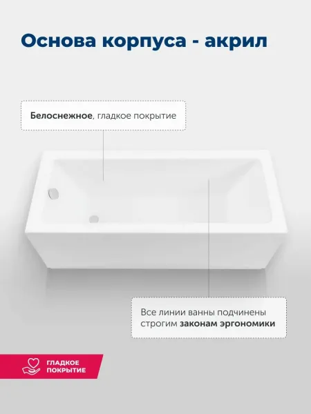 Пологая спинка спроектирована таким образом, что обеспечиваются комфорт и расслабление мышц тела. Расположение слива стандартное — в области ног. Модель установлена на прочный и устойчивый металлический каркас с регулируемыми ножками, позволяющими расположить ее на удобной высоте. Чтобы закрыть пространство под ванной, можно использовать панели: фронтальную и/или боковую.