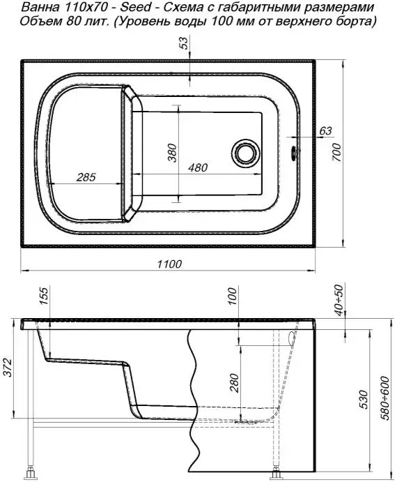 Акриловая ванна Aquanet Seed 110x70 - суперкомпактная модель, которая поместится даже в самом скромном по размерам помещении. В ширину она 70 см, а вот длину имеет необычно маленькую – всего 110 см. Принимать ванну взрослому человеку в ней можно только сидя, поэтому для удобства в ванне предусмотрено сидение. Впрочем, даже в таком положении при глубине 372 мм от слива ванны до борта в нее можно погрузиться всем телом. В ванну входит 80 литров воды. Маленькая ванна Seed по качеству не уступает своим более габаритным собратьям. Она сформована из сантехнического акрила европейского производства, покрыта для прочности двойным слоем стеклоровинга с установкой в местах наибольшей нагрузки закладных из МДФ-плиты. У нее широкие борта, которые подойдут для установки каскадного смесителя или которые можно использовать в качестве полочки для гигиенических средств. А поверхность чаши белоснежная и глянцевая, приятная на ощупь.