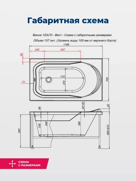 Акриловая ванна Aquanet West 347174 120x70 см с каркасом и фронтальной панелью