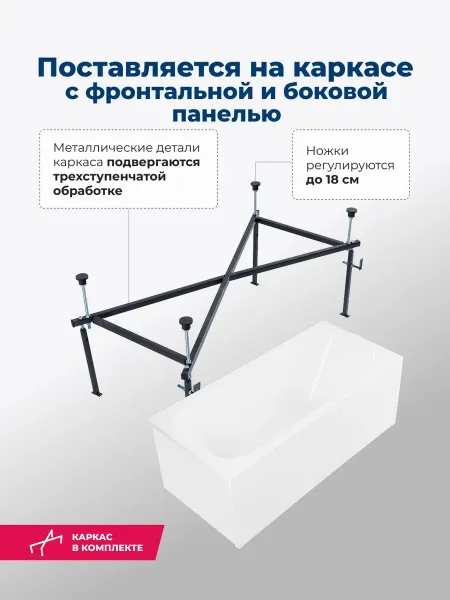 Ванна уже установлена на жесткий сварной каркас из металлического профиля. Металлические детали каркаса подвергаются трехступенчатой обработке, когда сначала профильная труба проходит абразивную зачистку на специальном станке, после чего готовые детали обрабатывают каустической содой, и, просушив, покрывают с помощью электростатического распылителя молотковой краской по металлу. Это гарантирует равномерность окрашивания и стойкость покрытия.