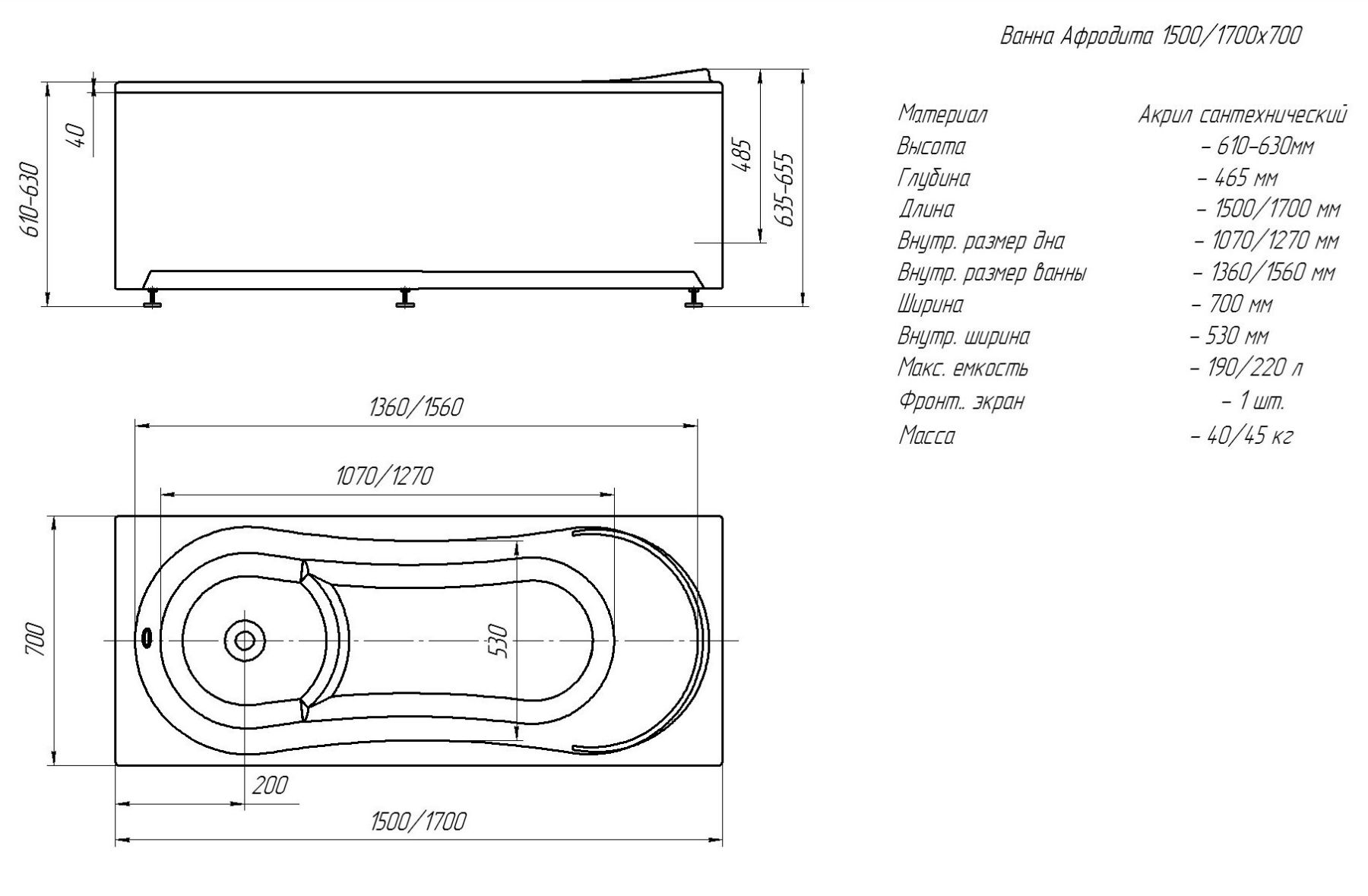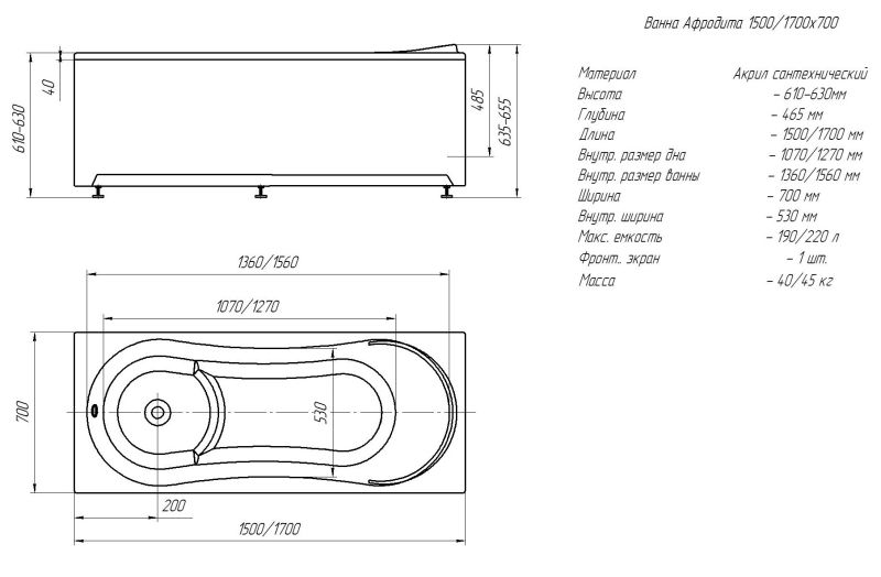 Габариты (Д Ш), см: 170х70Высота с опорой, см: 68Объем, л: 190 Форма: прямоугольнаяМонтаж: пристеннаяРасположение перелива: стандартноеДиаметр слива ванны, см: 5,2Материал: 100% литьевой акрилТолщина акрилового листа, мм: 4Гарантия: 20 летСтрана: Россия Вид опоры: каркас сборно-разборный сварной, есть в комплектеЭкран: фронтальный и боковой, приобретаются отдельноСлив-перелив: есть, в комплектеАнтискользящее покрытие: нескользкая поверхностьПодголовник: приобретается отдельноРучки: приобретаются отдельно Система гидромассажа: установка по желаниюАэромассаж: установка по желаниюХромотерапия: установка по желаниюРучки, поручни для ванны: установка по желаниюВстроенные смесители: установка по желаниюИзменение конструкции каркаса: установка по желаниюОзонирование: нет, установка не предусмотренаЗащита от сухого пуска: установка по желанию