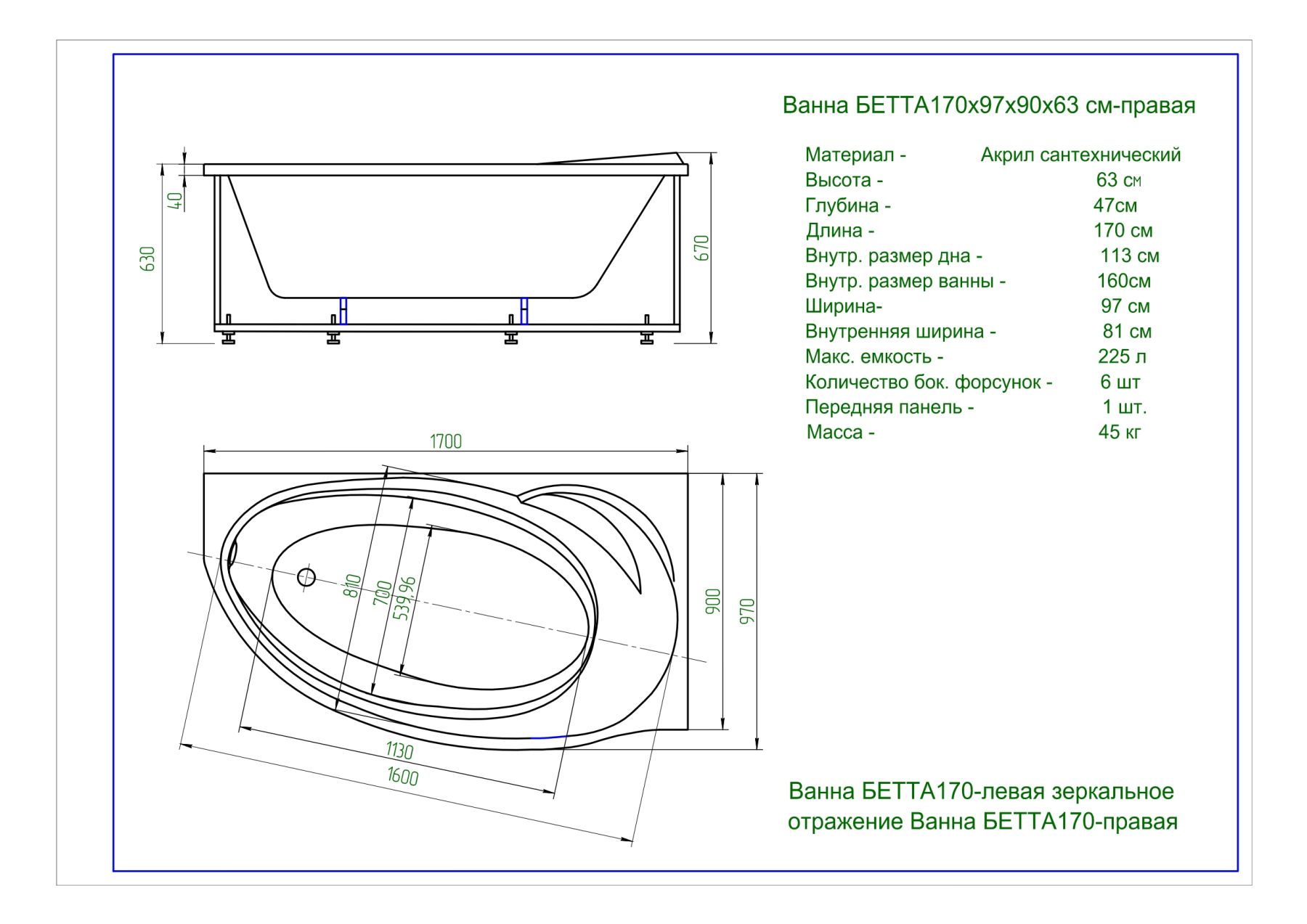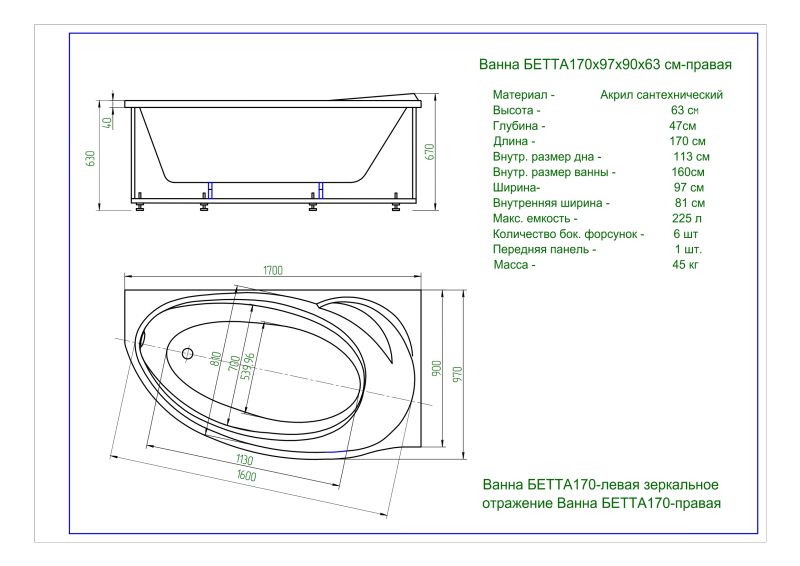 Габариты (Д Ш), см: 170х97Высота с опорой, см: 67Объем, л: 225 Форма: асимметричнаяМонтаж: пристеннаяРасположение перелива: стандартноеДиаметр слива ванны, см: 5,2Материал: 100% литьевой акрилТолщина акрилового листа, мм: 4Гарантия: 20 летСтрана: Россия Вид опоры: каркас сборно-разборный сварной, приобретается отдельноЭкран: фронтальный, приобретается отдельноСлив-перелив: приобретается отдельноАнтискользящее покрытие: не скользкая поверхностьПодголовник: приобретается отдельноРучки: приобретаются отдельно Система гидромассажа: установка по желаниюАэромассаж: установка по желаниюХромотерапия: установка по желаниюРучки, поручни для ванны: установка по желаниюВстроенные смесители: установка по желаниюИзменение конструкции каркаса: установка по желаниюОзонирование: нет, установка не предусмотренаЗащита от сухого пуска: установка по желаниюУправление: любое по желанию