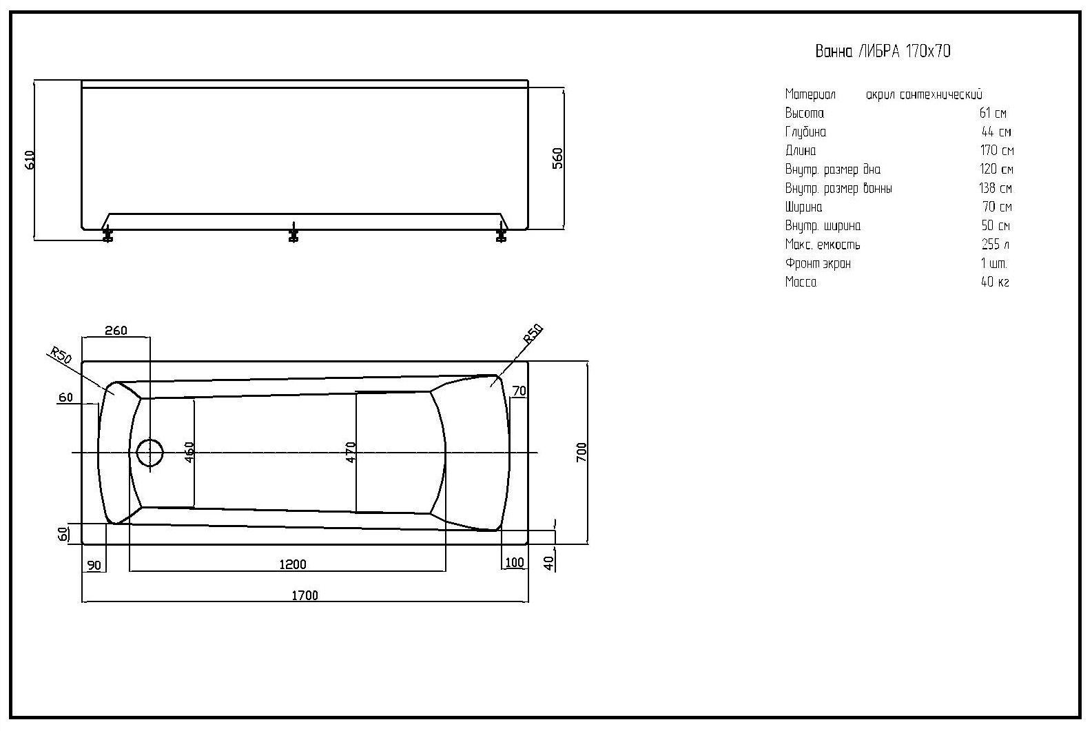 Габариты (Д Ш), см: 170х70Высота с опорой, см: 61Объем, л: 255 Форма: прямоугольнаяМонтаж: пристеннаяРасположение перелива: стандартноеДиаметр слива ванны, см: 5,2Материал: 100% литьевой акрилТолщина акрилового листа, мм: 4Гарантия: 20 летСтрана: Россия Вид опоры: каркас сборно-разборный сварной, есть в комплектеЭкран: фронтальный, в комплектеСлив-перелив: есть, в комплектеАнтискользящее покрытие: нескользкая поверхностьПодголовник: приобретается отдельноРучки: приобретаются отдельно Система гидромассажа: установка по желаниюАэромассаж: установка по желаниюХромотерапия: установка по желаниюРучки, поручни для ванны: установка по желаниюВстроенные смесители: установка по желаниюИзменение конструкции каркаса: установка по желаниюОзонирование: нет, установка не предусмотренаЗащита от сухого пуска: установка по желаниюУправление: любое по желанию