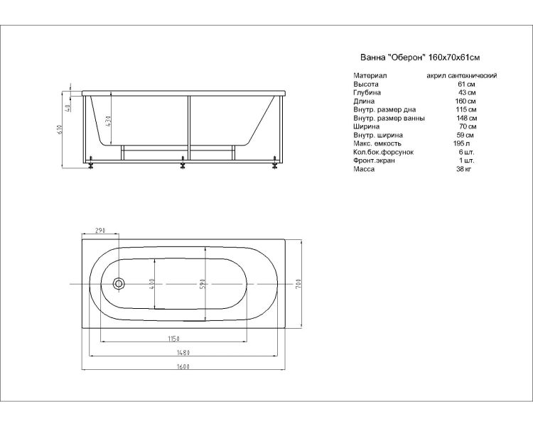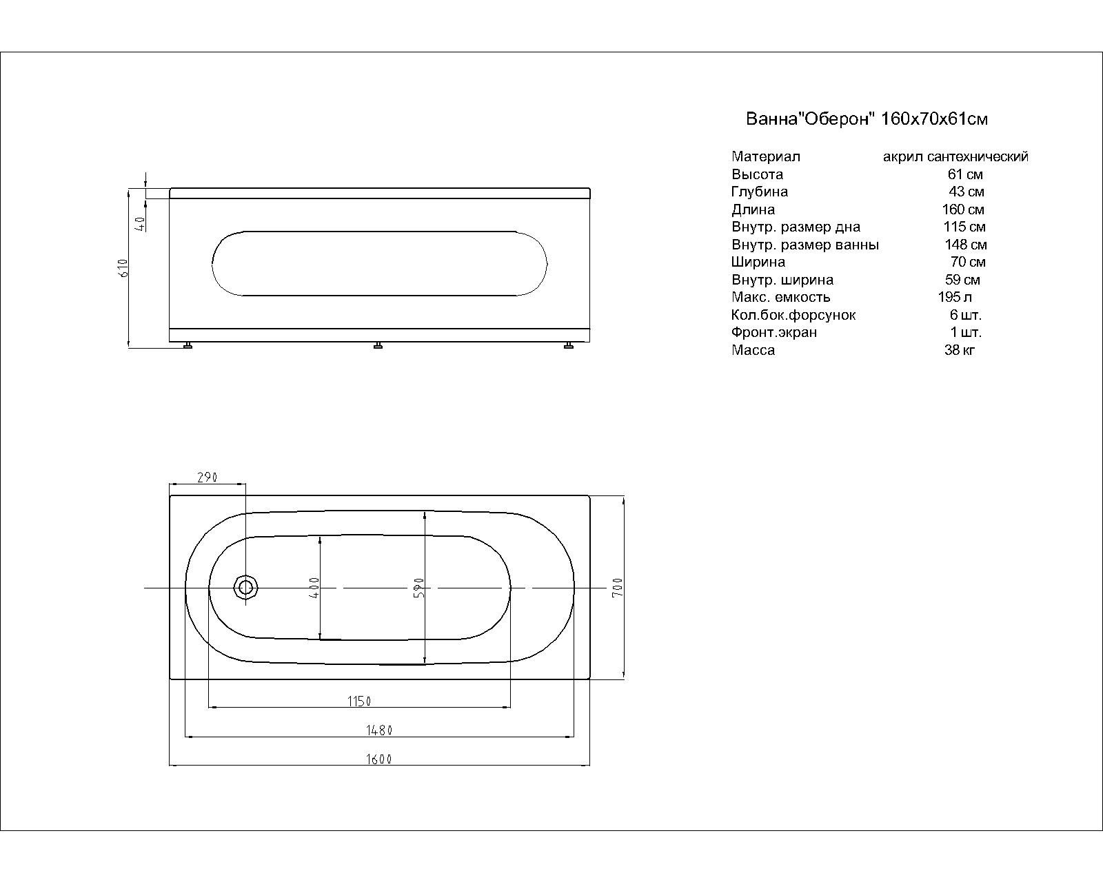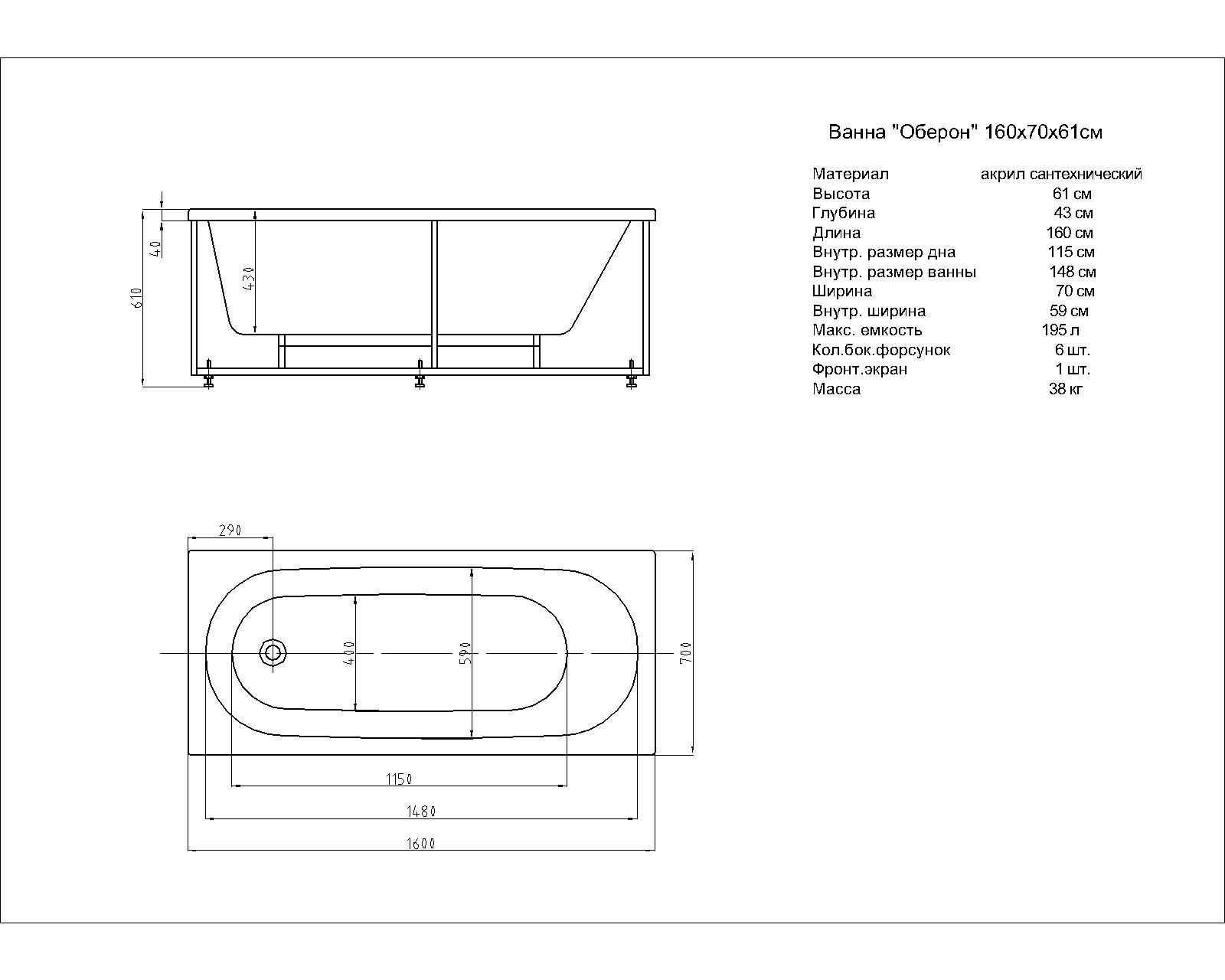 Габариты (Д Ш), см: 160х70Высота с опорой, см: 61Объем, л: 195 Форма: прямоугольнаяМонтаж: пристеннаяРасположение перелива: стандартноеДиаметр слива ванны, см: 5,2Материал: 100% литьевой акрилТолщина акрилового листа, мм: 4Гарантия: 20 летСтрана: Россия Вид опоры: каркас или ножки опорный, приобретаются отдельноЭкран: фронтальный и боковой, приобретаются отдельноСлив-перелив: приобретается отдельноАнтискользящее покрытие: нескользкая поверхностьПодголовник: приобретается отдельноРучки: приобретаются отдельно Система гидромассажа: установка по желаниюАэромассаж: установка по желаниюХромотерапия: установка по желаниюРучки, поручни для ванны: установка по желаниюВстроенные смесители: установка по желаниюИзменение конструкции каркаса: установка по желаниюОзонирование: нет, установка не предусмотренаЗащита от сухого пуска: установка по желаниюУправление: любое по желанию