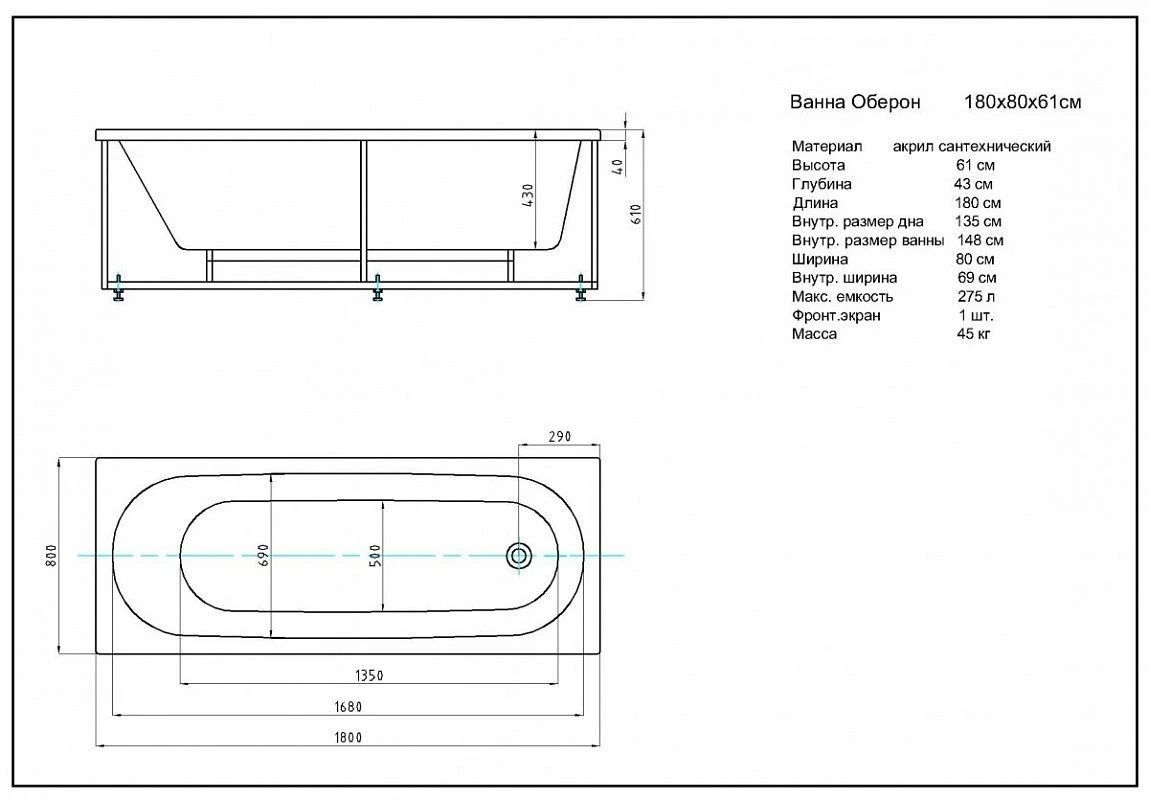 Акриловая ванна Aquatek Оберон OBR180-0000002 180х80 см с фронтальным экраном вклеенный цельносварной металлический каркас