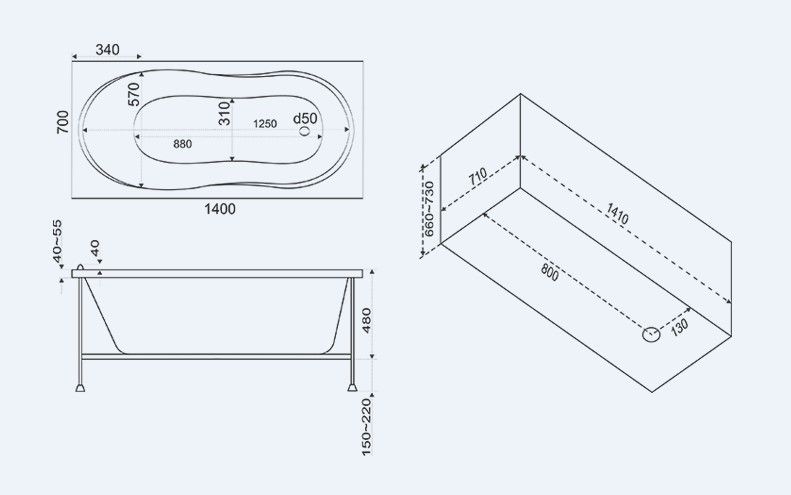 Акриловая ванна BAS Тесса 140x70 с каркасом