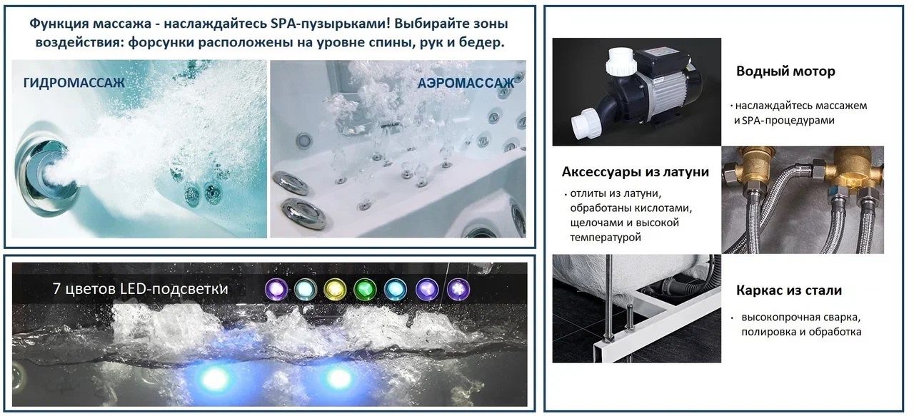 Гидромассаж и хромотерапия оказывают положительное влияние на здоровье. Водные струи расслабляют мышцы, активизируют кровообращение и обмен веществ. Тандем гидромассажа и хромотерапии помогает справиться с хронической усталостью, отечностью, способствует улучшению сна.Современная акриловая гидромассажная ванна Ceruttispa C-401А – выполнена из 100% акрила и закаленного стекла. Ударопрочное стекло толщиной 10 мм без металлической окантовки безопасно и придает ванне современный дизайн.Ванна, изготовленная из 100% акрила не имеет микропор, в которых могли бы скапливаться микробы и бактерии. За счет этого поверхность легко чистить обычной водой и губкой (при необходимости с добавлением жидких моющих средств без абразивов). Не смотря на ощущаемую гладкость, акрил обладает отличающим такую ванну от ванн из камня, стали, чугуна - антискользящими свойствами. Внимание! Производитель оставляет за собой право вносить изменения в конструкцию и комплектацию моделей без предварительного уведомления!