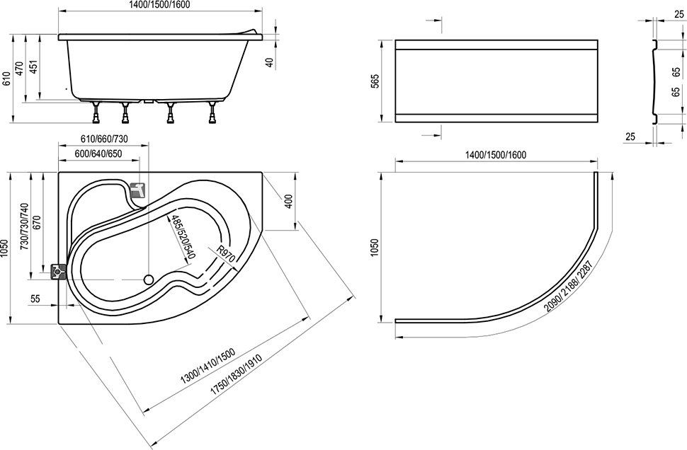 - аксессуары: передняя панель, сточный комплект для ванны, подголовник, ручки