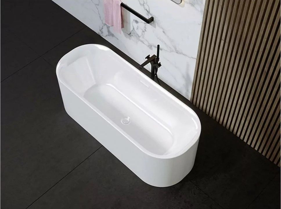 Белая глянцевая ванна поставляется в стандартной комплектации с хромированным сливом переливом