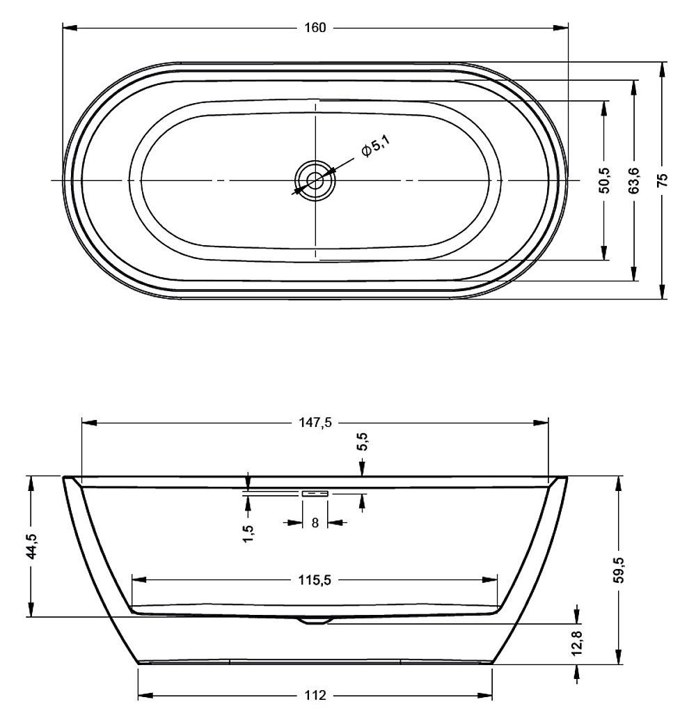 Отдельно стоящая, матовая чёрная акриловая ванна RIHO Inspire 160х75 с двойными стенками, со встроенным переливом и нажимным донным клапаном.