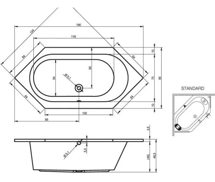 Ванна имеет оригинальную шестиугольную форму с большим внутренним объёмом, позволяющим принимать комфортные водные процедуры.