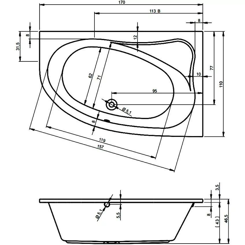 Асимметричная акриловая ванна RIHO Lyra 170x110L изготовлена из высококачественного листа акрила глянцевого белого цвета.