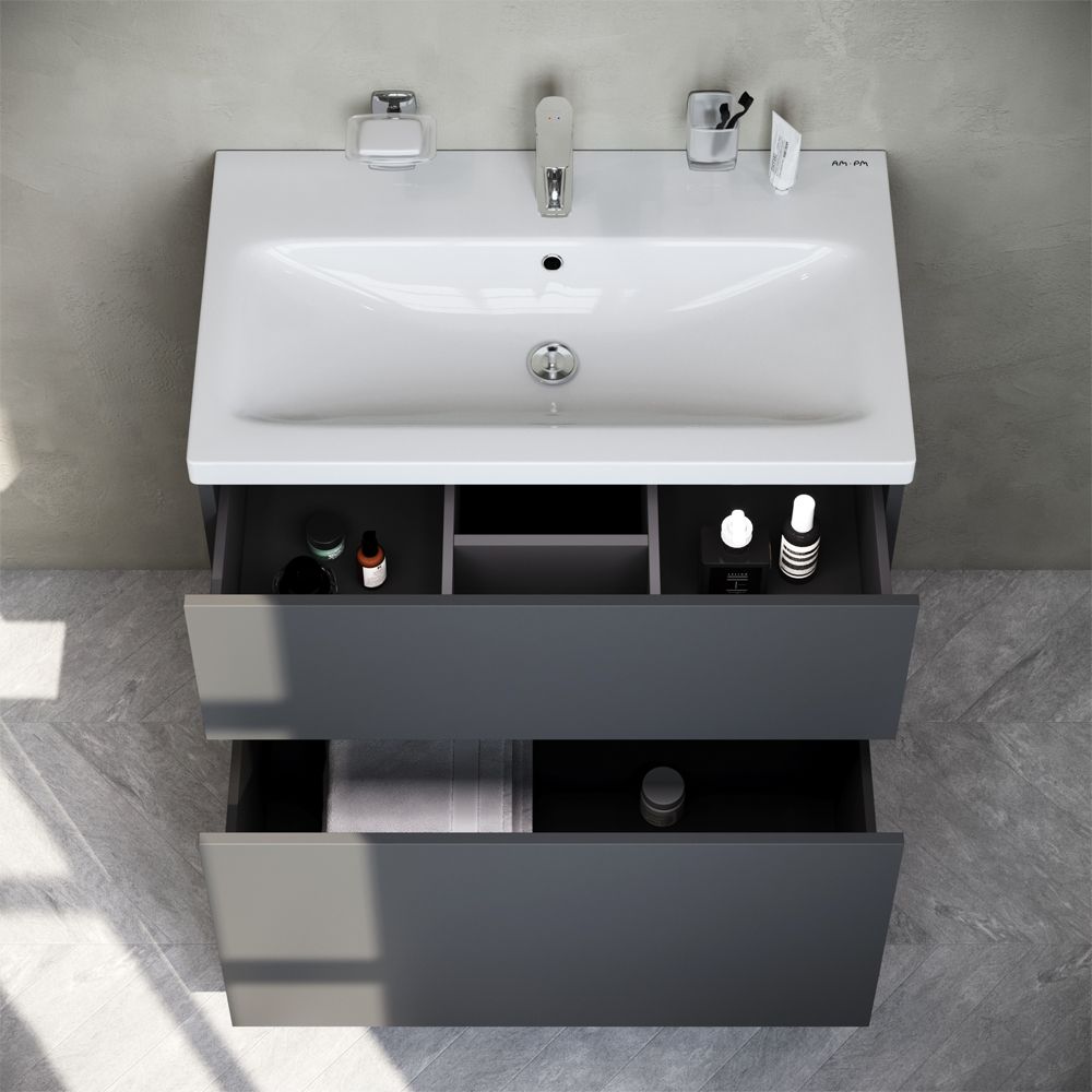 Подвесная мебель для ванной Am.Pm GEM идеально подойдет тем, кто предпочитает минимализм в интерьере и выбирает абсолютный комфорт. Современный европейский дизайн от DanelonMeroni (Великобритания/Италия) Самая компактная и функциональная раковина на рынке: проекция всего 42 см при максимальной глубине чаши!Фурнитура push-to-open - открывание ящика нажатием на фасад. Ящики с антискользящим покрытием цвета антрацит – европейский стандарт.