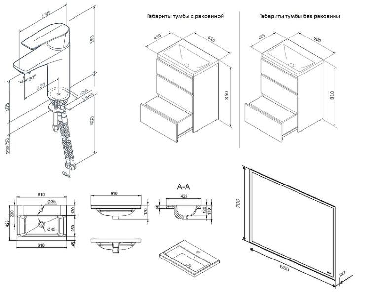 Тумба под раковину:Компактное решение: узкая база с глубокими ящиками.