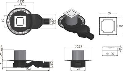 Решетка толщина 3мм, нержавеющая сталь AISI 304 Горловина трапа, пластик Фланец трапапа с переходником, РР Монтажная заглушка, PP Самопромывной S-образный сифон PP: горизонтальный выпуск D50 H60, пропускная способность 42л/мин, монтаж 360° Монтажный ключ, пластик