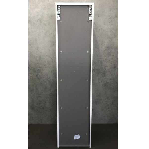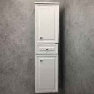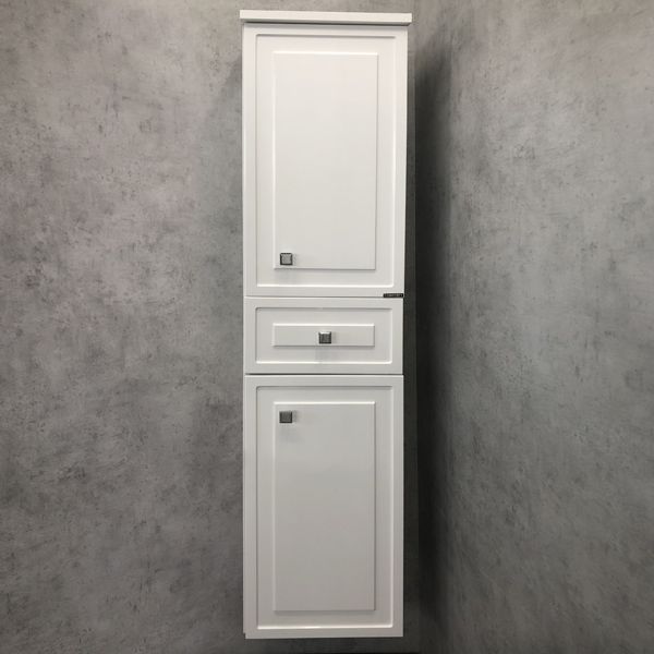 Подвесная шкаф-колонна отличное решение для хранения разных предметов необходимых в ванной комнате. Створки открываются влево, оснащены петлями с плавным закрыванием. Фасады покрыты белой глянцевой эмалью. За верхней и нижней дверцей по одной полке.