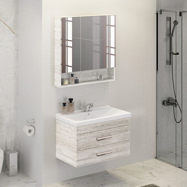 Название: Тумба-умывальник Артикул: Никосия 80 Варианты цвета корпуса и фасадов: Дуб белый Материал корпуса и фасадов: влагостойкое ЛДСП Габариты (ШхВхГ): 800*530*455 мм Комплектация: раковина Fest 80 (санитарный фарфор) Подвесная тумба с двумя выдвижными ящиками оснащенными системой плавного закрывания. Оригинальные эргономичные металлические ручки.