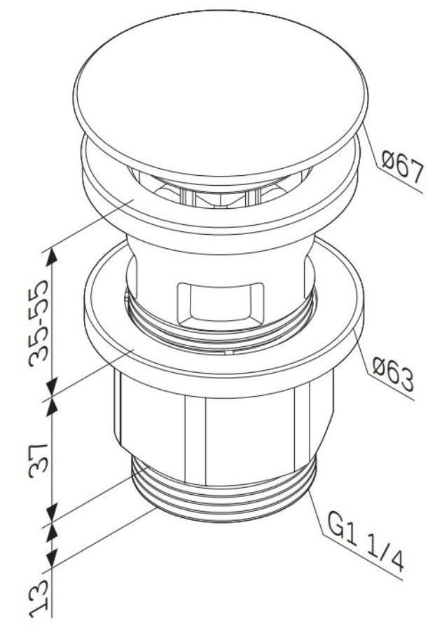 С отверстием для подключения перелива, позволяющего выпускать воду из раковины при ее переполнении через отверстие в нижней части перелива. Система клик-клак, управляется нажатием на пробку слива. Покрытие устойчиво к коррозии, появлению царапин, сколов и потускнению. Круглая заглушка черного матового цвета. Подключение к сифону: G1 1/4