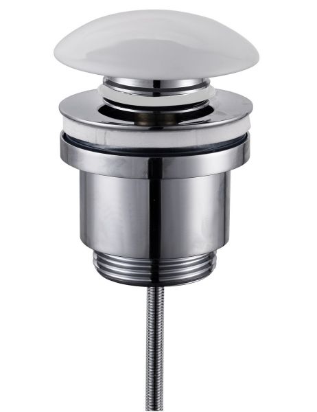 Донный клапан R600.01.38 хорошо впишется в сочетании с открытыми сифонами. Плотно прилегает к сливу и мешает поступлению воды и неприятных запахов из канализации. Сделан из латуни. Крышка - керамическая белая. Не будет ржаветь и не потеряет блеск со временем. Клапан автоматический, чтобы перекрыть отверстие достаточно легкого нажатия на поверхность корпуса. В таком механизме пробка не потеряется. Конструкция качественная и надежная.