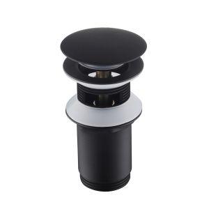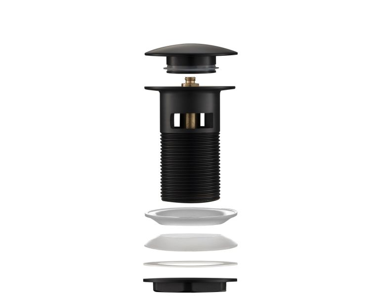 Донный калапан для раковины с переливом. Сделан из латуни. Режим "клик-клак" или атовмат. Цвет: черный.