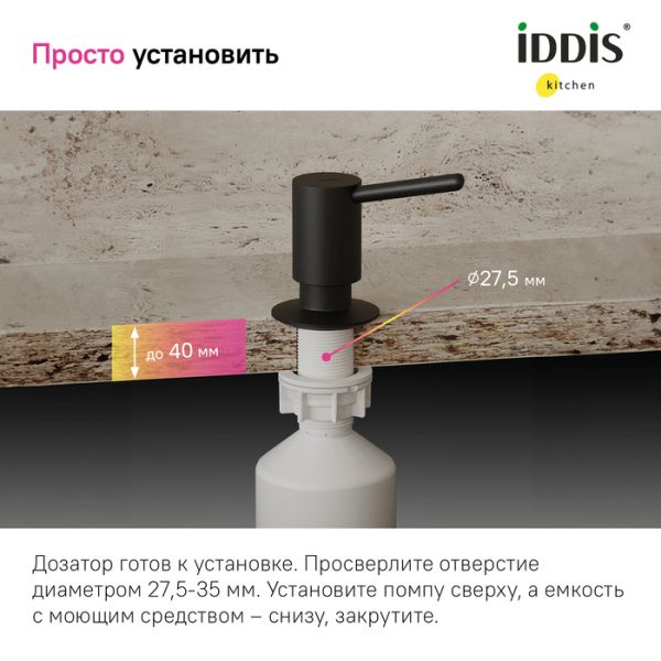 Встраиваемый в столешницу дозатор – незаменимый аксессуар для кухни, где ничто не должно отвлекать от красивого интерьера. Выглядит эстетично и занимает минимум места, освобождая его для действительно важных вещей. Трендовый цвет и универсальный дизайн сочетаются с черными смесителями и мойками IDDIS® и других производителей. Отверстие для установки – 29-37 мм.