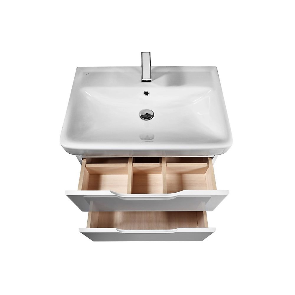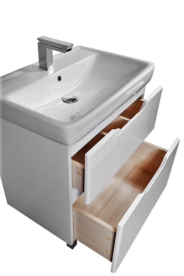Напольная коллекция Идеально вписывается в любой интерьер ванной комнаты, глянцевая поверхность фасада. В комплект можно докупить зеркальные шкафы, пенал, полупенал. Хромированные регулируемые передние ножки. Верхний ящик с органайзером
