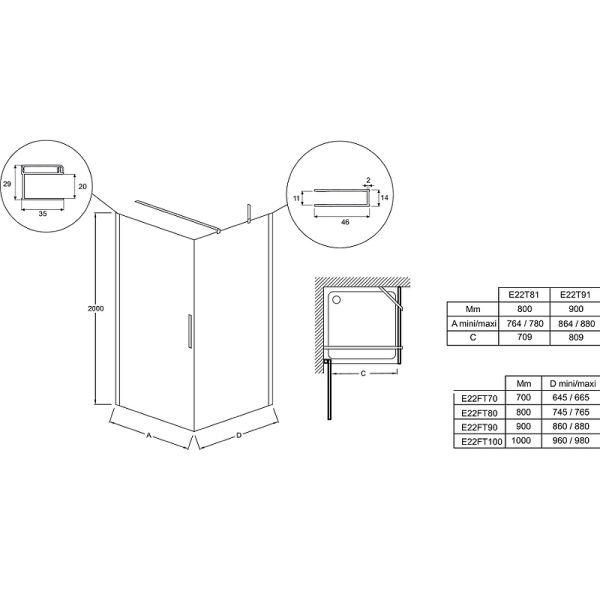 Душевая дверь Contra Black 80х200 E22T81-BL регулируется по ширине, снабжена магнитными замками и широкими стильными ручками.Технические данные:Профиль: черный.