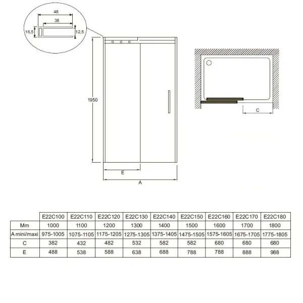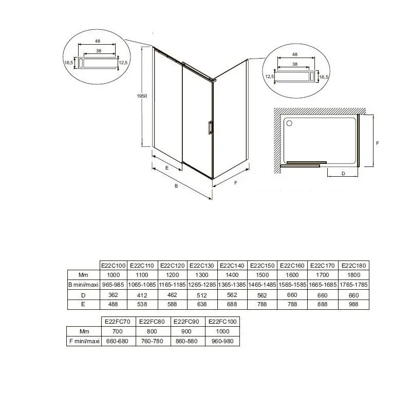 • Мин./максширина двери с фиксированной панелью: 96,5 - 98,5 см