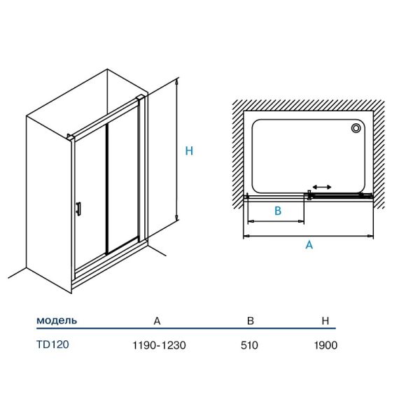 Душевая дверь в нишу Koller Pool Aqua Line 120 х 190 см, стекло прозрачное/матовое, профиль хром, TD120C/TD120GДушевая двухсекционная дверь ТD120. Размер двери 1200×1900 мм, имеет хромированный профиль, прозрачное или матовое стекло толщиной 6 мм.Основные характеристики:Дверь раздвижная