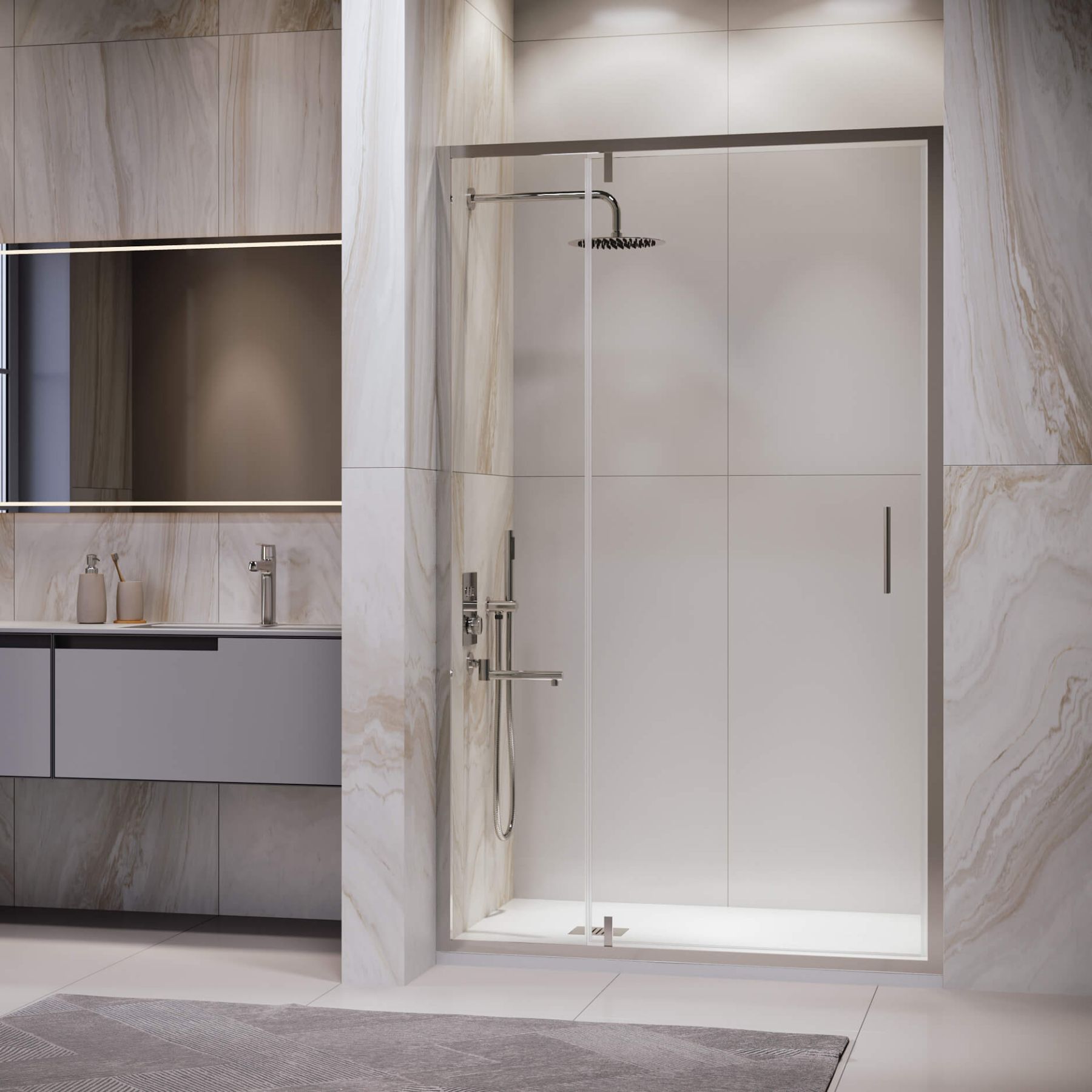 Элегантные стеклянные двери с пристенными профилями придают ванной комнате изысканность и строгость. Модели оснащены маятниковой петлёй, с защитой от провисания и подъёмом двери при открытии. Такой системой будет особенно удобно пользоваться если дверь установлена на плитку с встроенным трапом. Изделия оснащены Распашные двери открываются как наружу, так и внутрь, что обеспечит максимальный комфорт в процессе использования душевого пространства.Благодаря разнообразию размеров, подходят практически каждому клиенту.Ключевые характеристики: