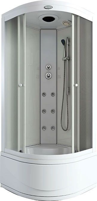 поддон высокий 40см фронтальные стекла матовые фактурные задние стекла матовые белые центральная панель пластик белый белый алюминиевый профиль регулируемые ролики белые ручки для дверей 3-х режимный смеситель ручная лейка на штанге 6 гидромассажных форсунок