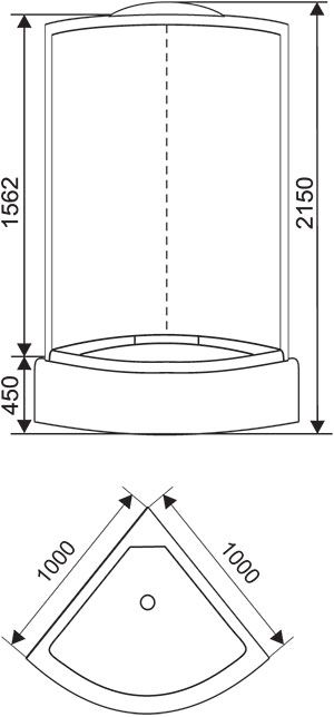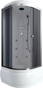 поддон высокий 45см фронтальные стекла матовые фактурные задняя панель ABS укрепленная хромированный алюминиевый профиль регулируемые ролики хромированные ручки для дверей 3-х режимный смеситель ручная лейка 6 гидромассажных форсунок верхняя лейка «тропический душ» полка