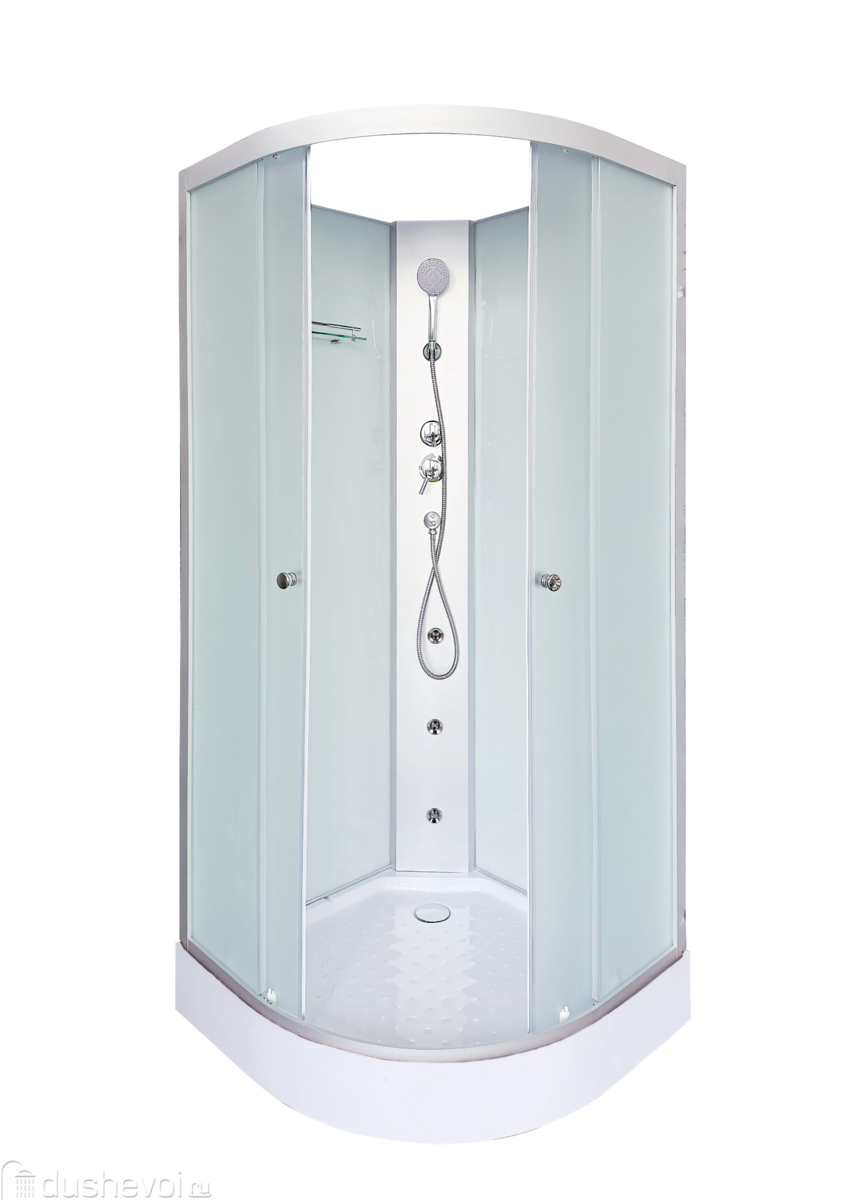 Каркас выполнен из алюминия с матовым хромированным покрытием, а задние стенки и двери сделаны из матового закаленного стекла толщиной 4 мм, обеспечивающего высокую прочность и безопасность. Поддон низкий (высота 15 см), изготовлен из акрила белого цвета, что упрощает вход в кабину и ухаживание за ней.