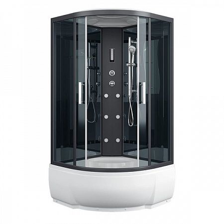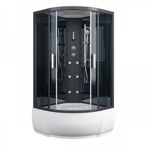 Центральная стойка черная, пластик"тропический душ, ручной душ 3х режимный, гидромассаж (кол-во форсунок 6 шт), верхний свет, сенсорный пульт, FM-радио, вентилятор, зеркало, полочка, рейлинг для душ-лейки.