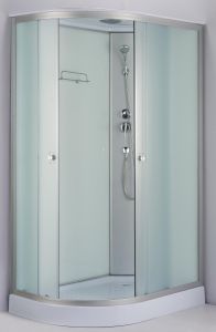 Поддон акриловый низкий 13см, глубина 5 см,сифон с гофрой,экран несъемный,профиль матовый хром,центральная панель серебро, задние стенки закаленные,белые,крашенные, передние стекла закаленные,матовые, смеситель 2-х режимный, верхний тропический душ, ручной душ,полочка. Разворот кабины(L/R)определяется по прямому углу