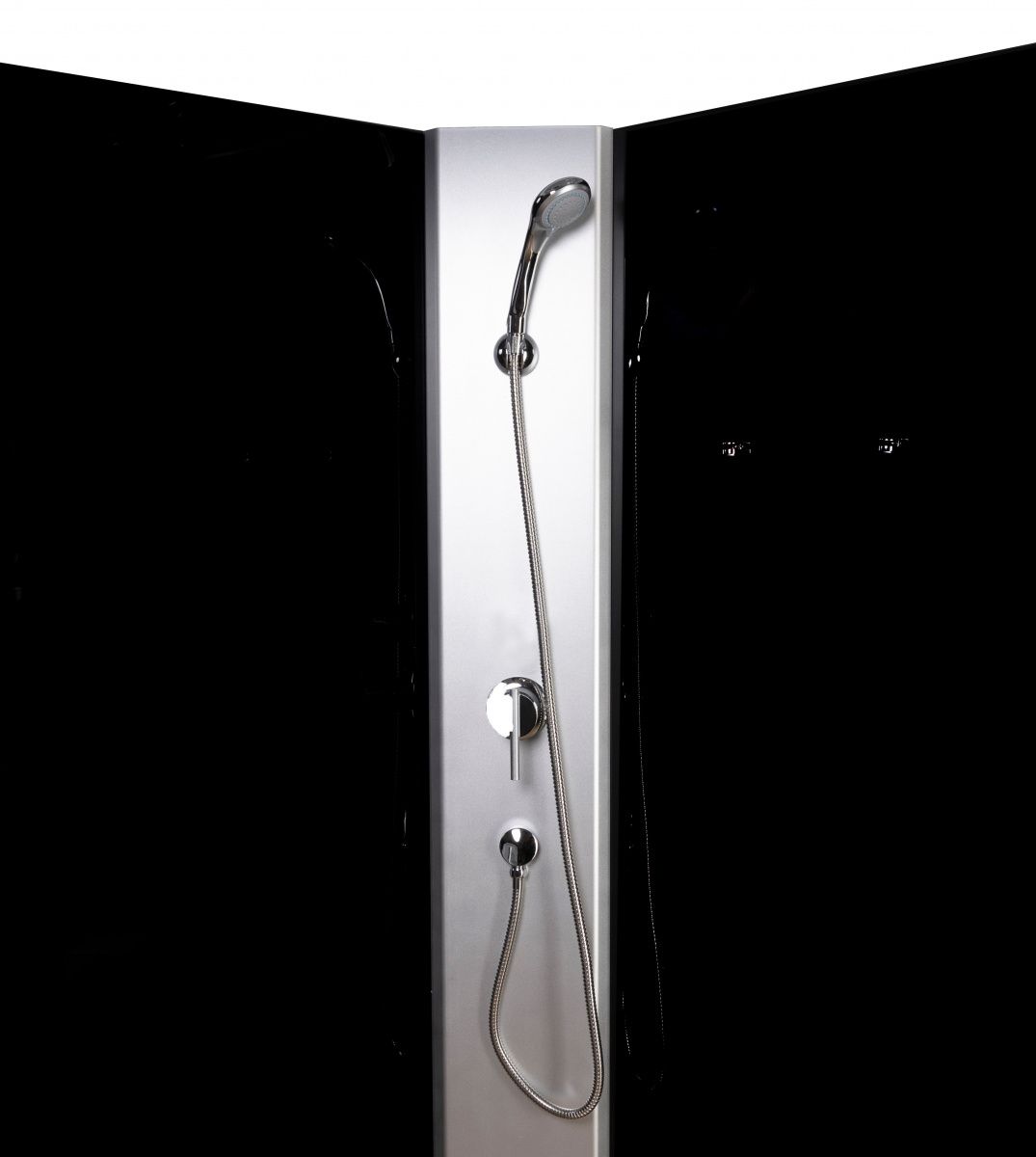 Комплектация: Поддон, сифон, панель, 4 профиля, 2 передние неподвижные стенки, 2 двери, 2 задние стенки, ручки, 8 ролика одноколесные, центральная панель, смеситель, полочка.