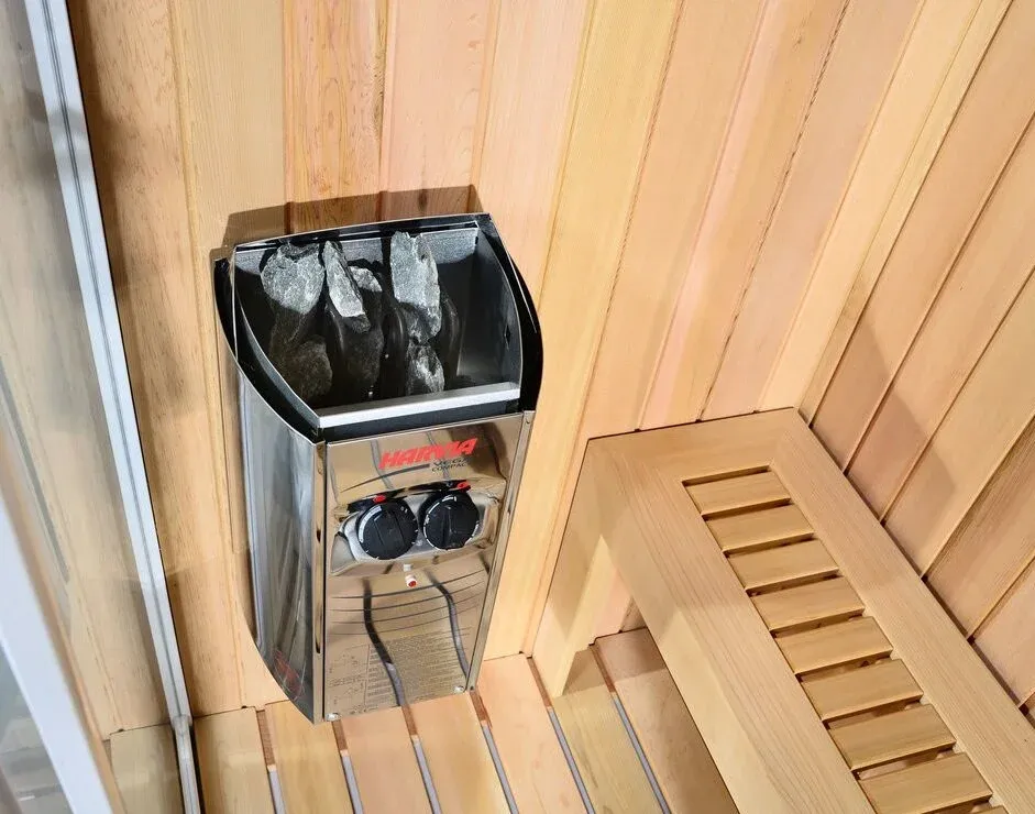 * Финская сауна: печка Harvia, банный камень 20 кг, скамья, гигрометр, песочные часы, абажур, шайка, черпак.