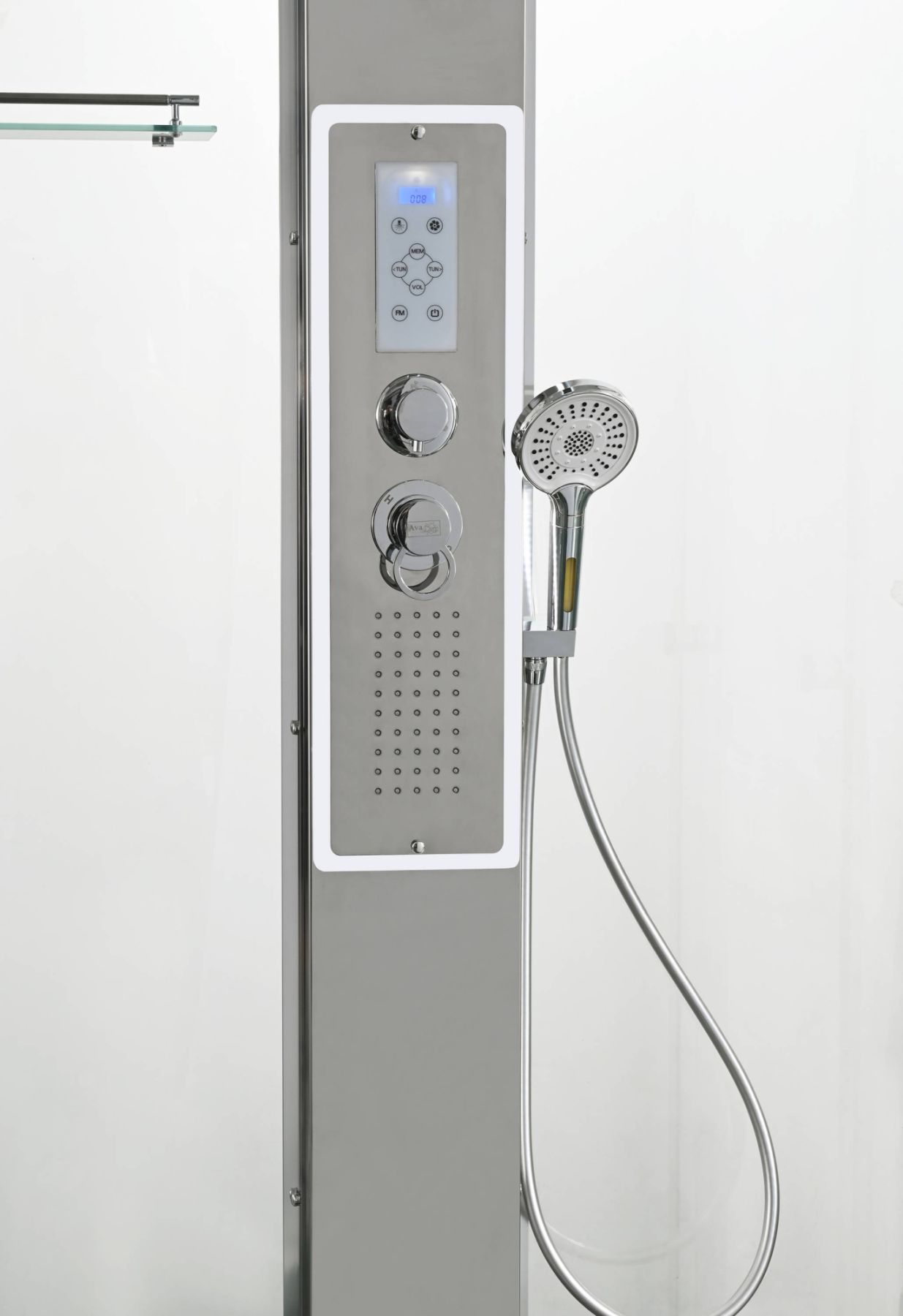 Стильная душевая кабина AvaCan сочетает в себе высокую функциональность, практичность и надежность. При изготовлении применяется безопасное закаленное стекло, надежно фиксируемое алюминиевым профилем.Профиль сделан из алюминия повышенной прочности. Сборка без силикона (увеличивает срок службы, защищает от протечек), внутренняя сборка (облегчает установку и ревизию; позволяет установить в ограниченном пространстве и обойтись без демонтажа других сантехнических приборов), смеситель резьбовой (без хомутов).Двойные металлические ролики дверей (распределение нагрузки на два ролика, увеличивают срок службы). Душевая штанга(позволяет регулировать по высоте ручную лейку), ручная арома-лейка с витамином С (картридж в комплекте,есть возможность замены или удаления картриджа), полочки(из стекла, с ограничителем), сифон с гидрозатвором, сенсорный пульт управления с функциями: блютуз, LED подсветка, радио, вытяжка, гидромассаж спины, тропический (верхний) душ.