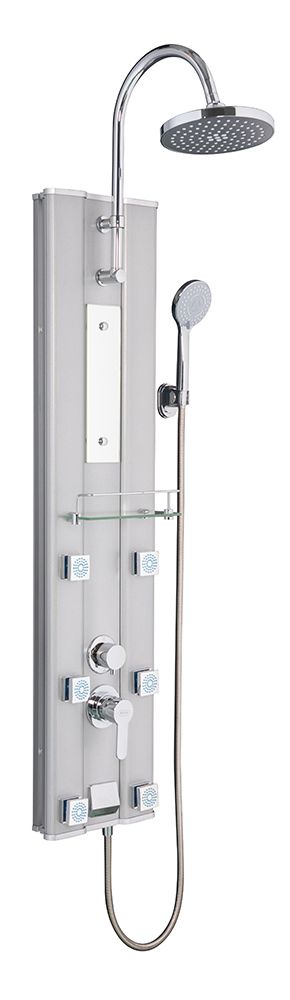 Панель алюминиваяРучной душ 3-х позиций Верхний душСмеситель с переключением режимов6 г/м форс.Набор водыПолочкаЗеркалоВозможна установка на стену и в угол