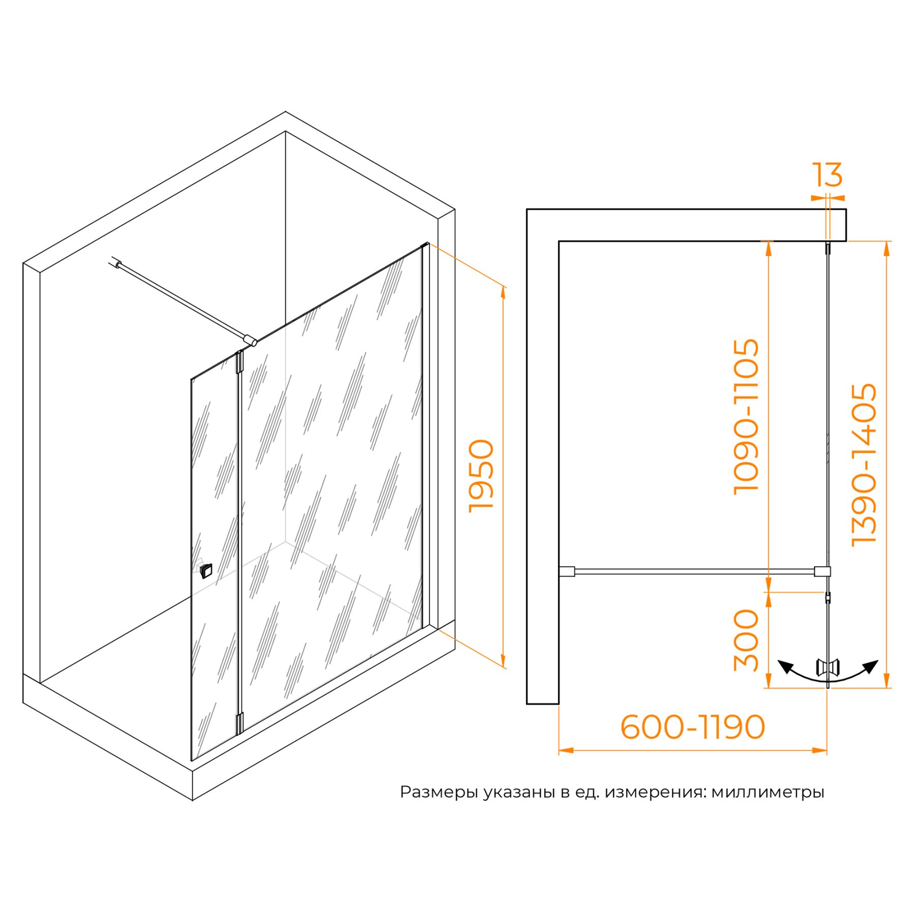 Душевая перегородка состоит из стационарного полотна и полотна с поворотной маятниковой частью - 300 мм. Стационарное стекольное полотно крепится к стене алюминиевым профилем с декоративной заглушкой. Подвижное полотно закреплено стальной маятниковой петлей с ходом 180 градусов.Перегородка выпускается с фурнитурой в 3-х вариантах:
