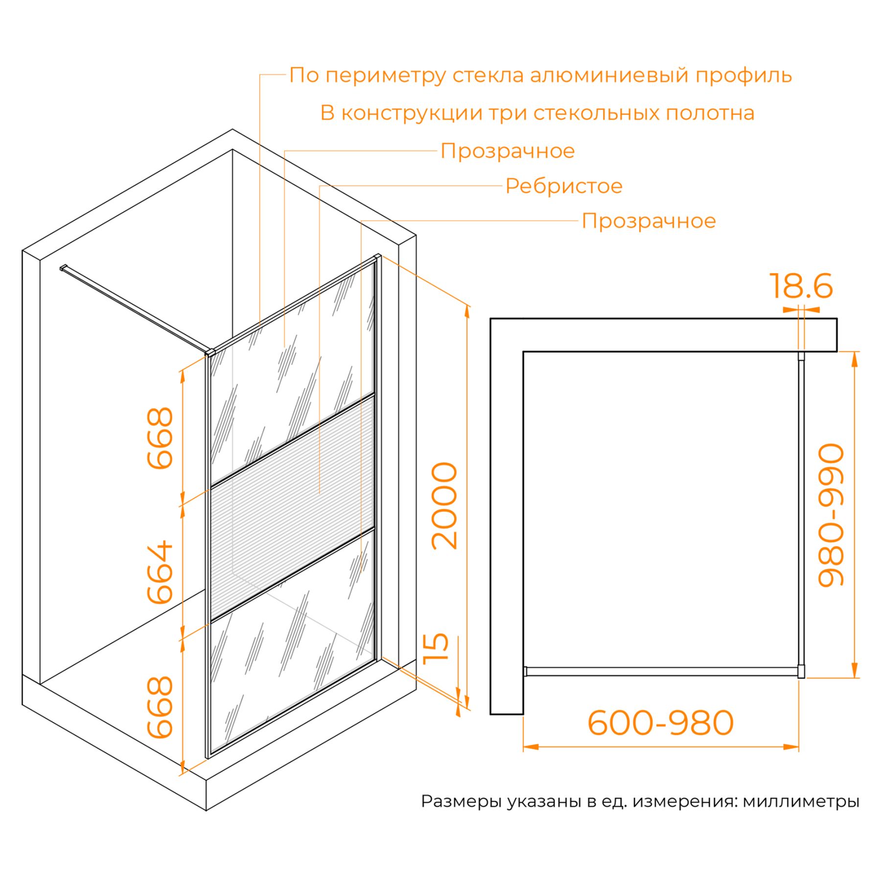 Высота изделия: 2000 мм (2 метра)Душевая перегородка изготовлена из закаленного стекла 8 мм. Стекло имеет высокую степень прочности и блеска!Гарантия: 3 года