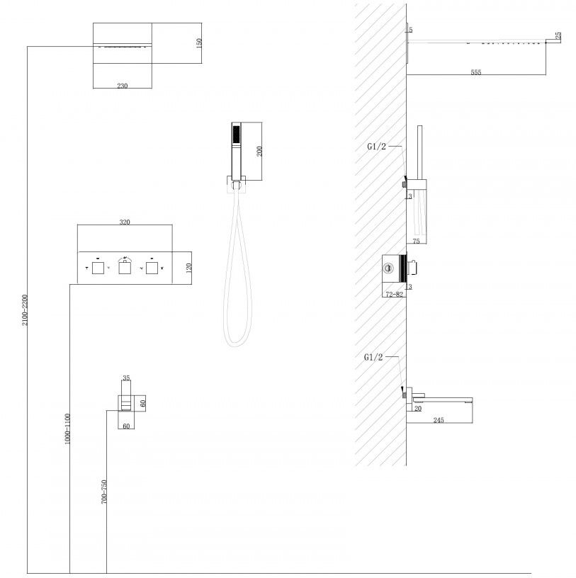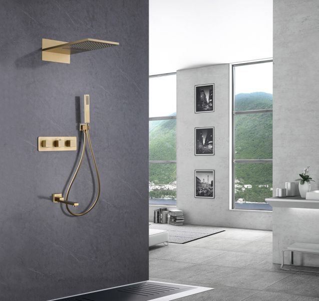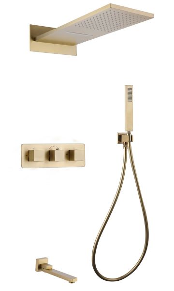 Душевой комплект ABBER отлично дополнит ванную комнату своим незаменимым функционалом. Душевые комплекты ABBER включают в себя все необходимое для создания идеального душевого пространства. Душевой комплект ABBER производится из высококачественных материалов, с отсутствием вредных примесей. Основной цвет исполнения ABBER – хром, идеально подходящий к душевой зоне выполненной в стиле hi-tech. Душевой комплект ABBER правильное решение в оснащении ванной комнаты.Душевая система скрытого монтажа с изливом, термостат, золото матовое