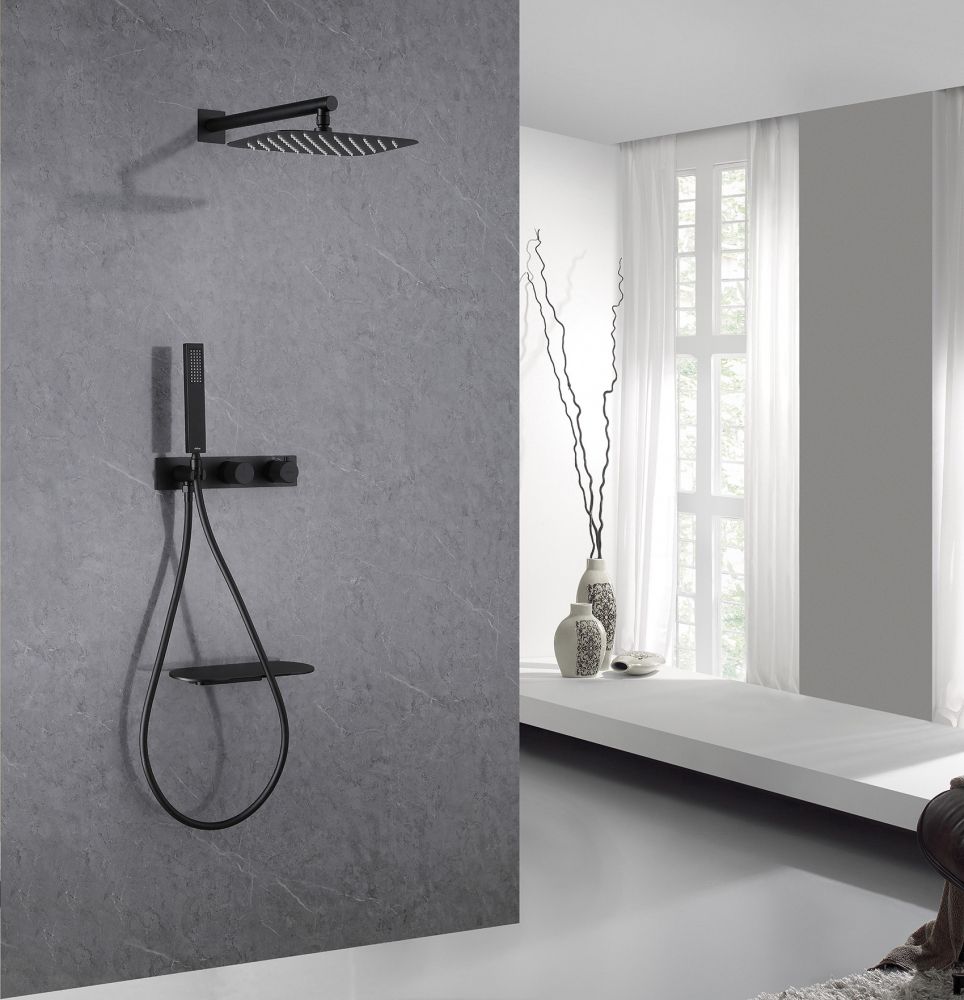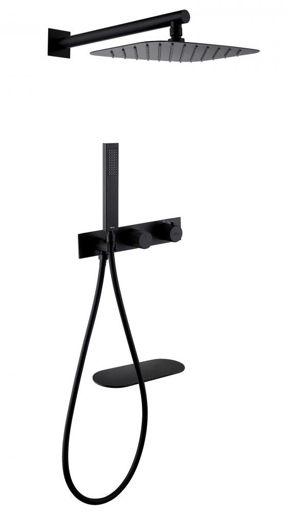 Душевой комплект ABBER отлично дополнит ванную комнату своим незаменимым функционалом. Душевые комплекты ABBER включают в себя все необходимое для создания идеального душевого пространства. Душевой комплект ABBER производится из высококачественных материалов, с отсутствием вредных примесей. Основной цвет исполнения ABBER – хром, идеально подходящий к душевой зоне выполненной в стиле hi-tech. Душевой комплект ABBER правильное решение в оснащении ванной комнаты.Душевая система скрытого монтажа с изливом, термостат, черная матовая