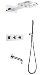 Душевой комплект ABBER роскошно дополнит вашу ванную комнату своим незаменимым функционалом. Душевые комплекты ABBER включают в себя все необходимое для создания идеального душевого пространства. Душевой комплект ABBER производится из высококачественных материалов, с отсутствием вредных примесей. Душевой комплект ABBER правильное решение в оснащении ванной комнаты.Душевая система скрытого монтажа с изливом, термостат, хром